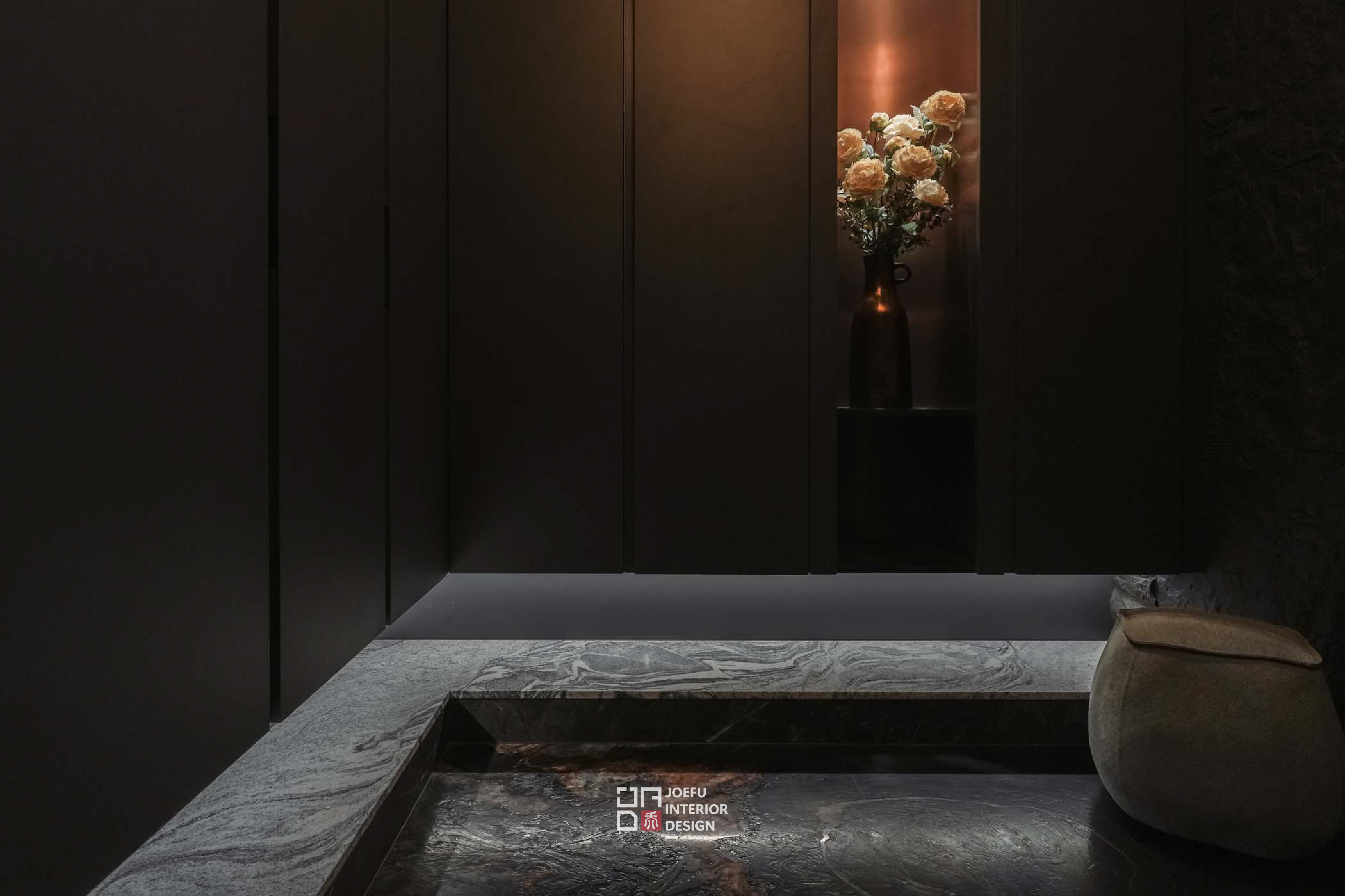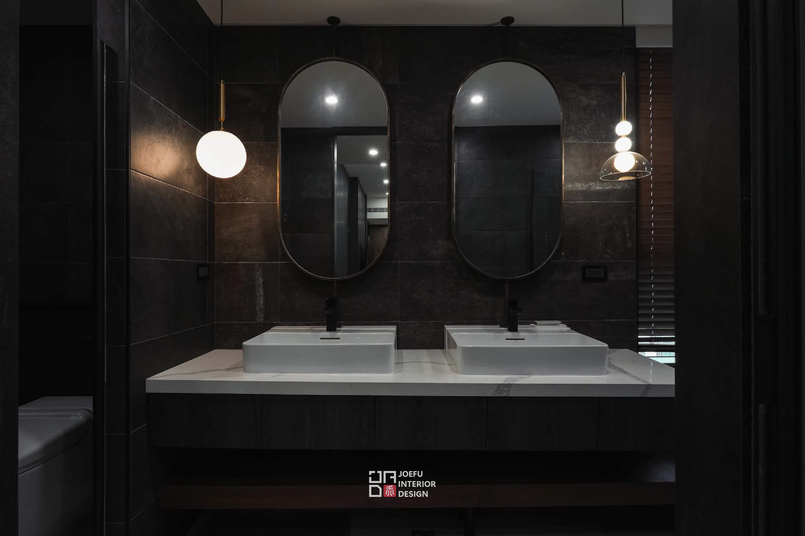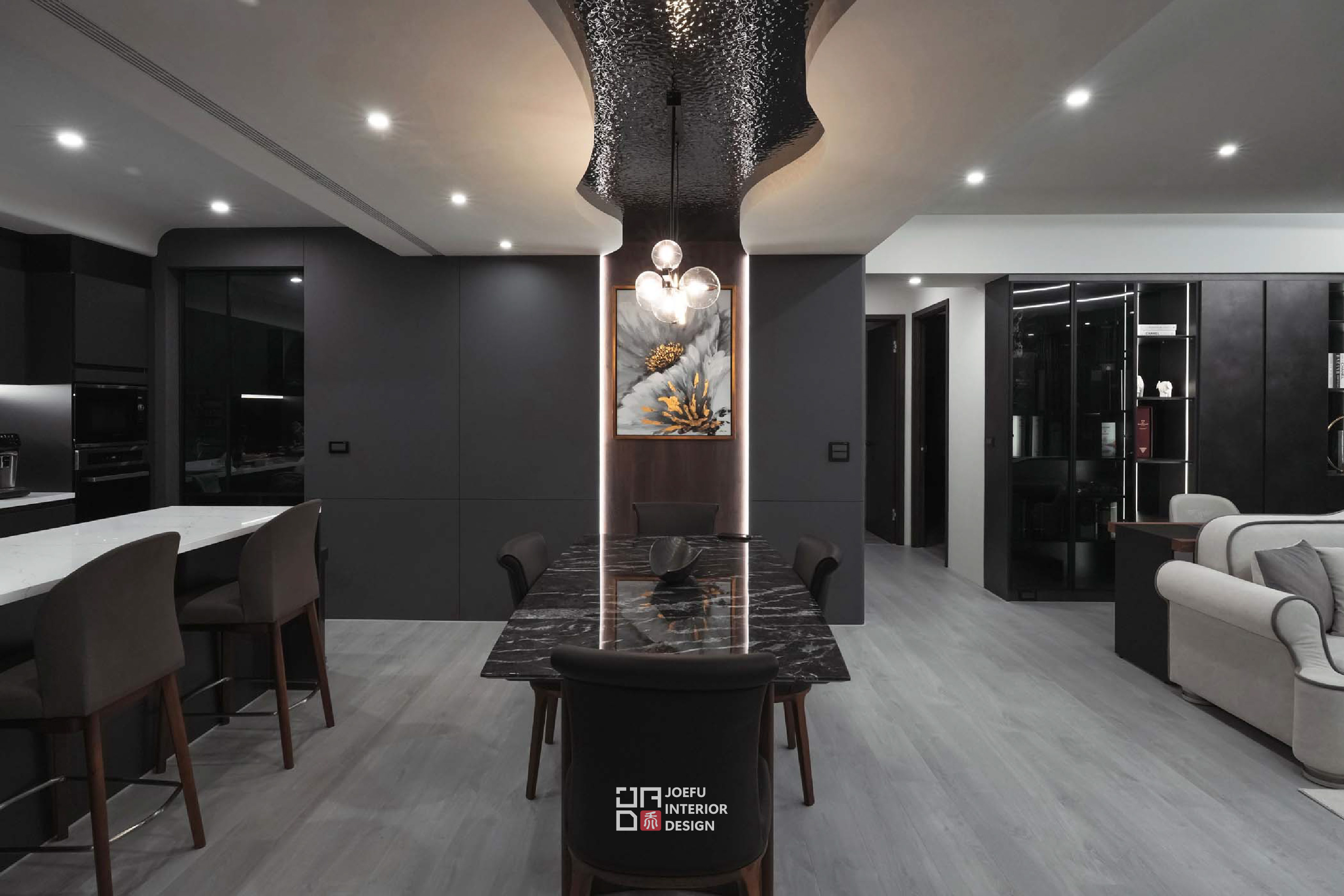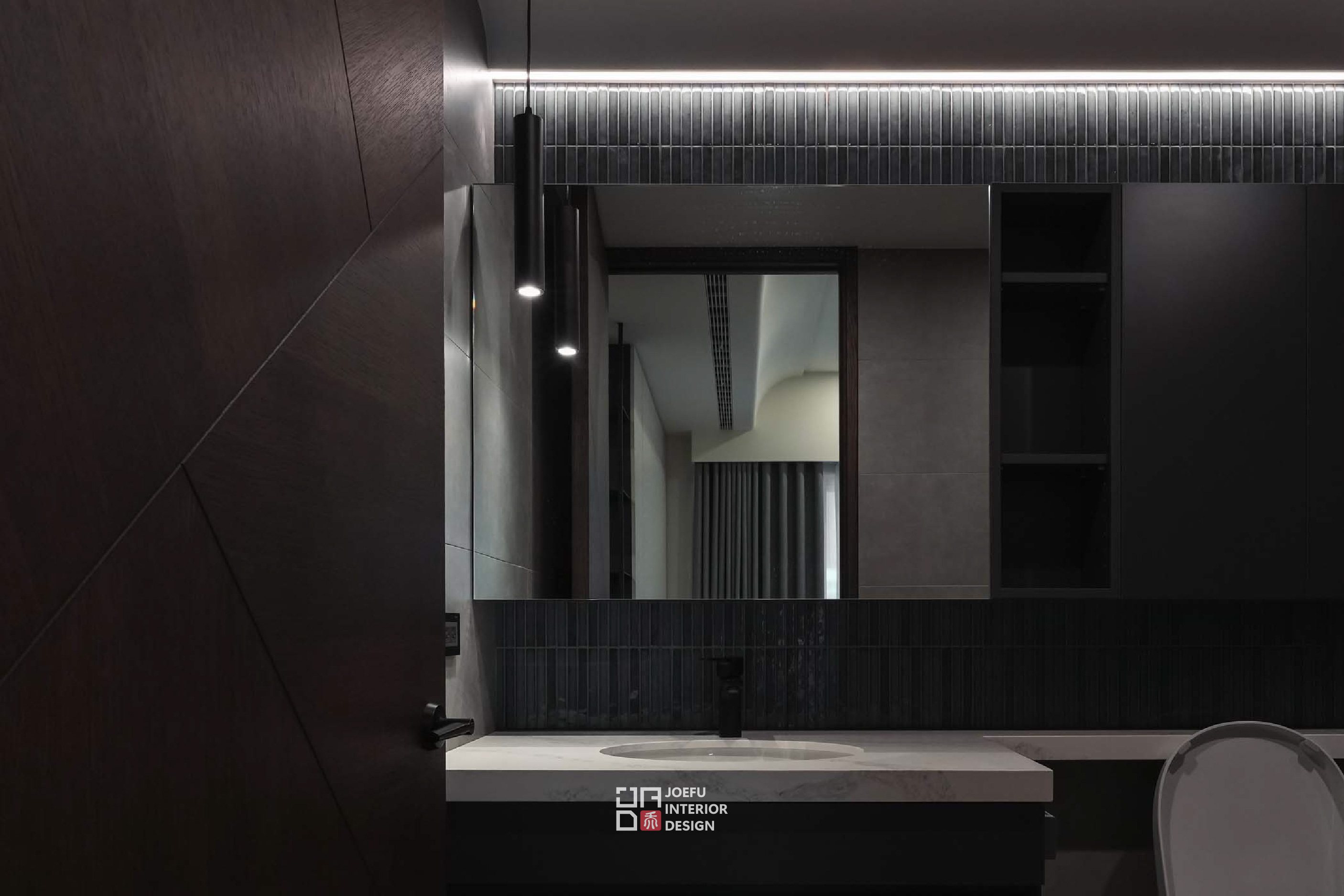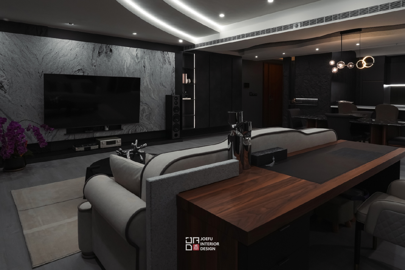 本案為毛胚屋,設計之初即設定以深色調為主軸,業主可接受沉穩色域與高對比材質,希望創造一處兼具男性氣質與精緻生活品味的空間。設計師從黑、灰、金屬的構圖中鋪陳材質層次,選用表面粗獷的石材以及帶有鏽蝕感的金屬作搭配