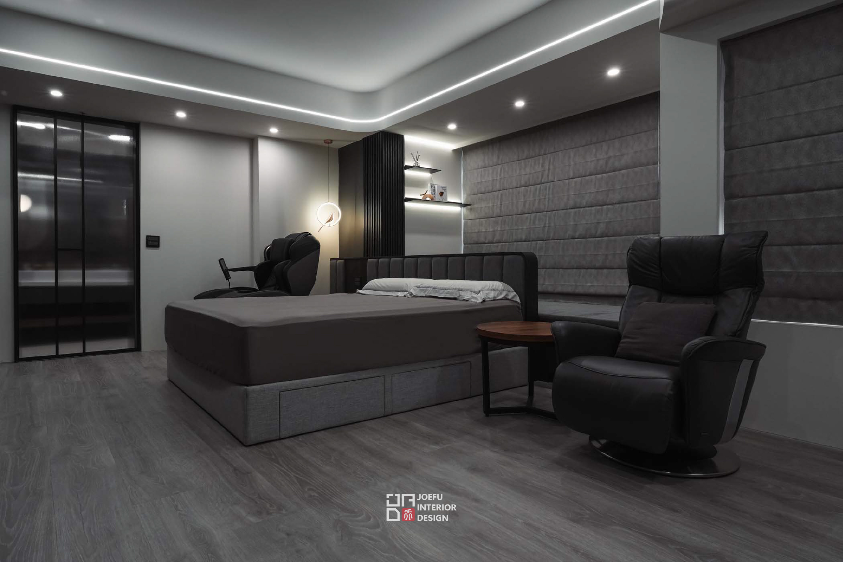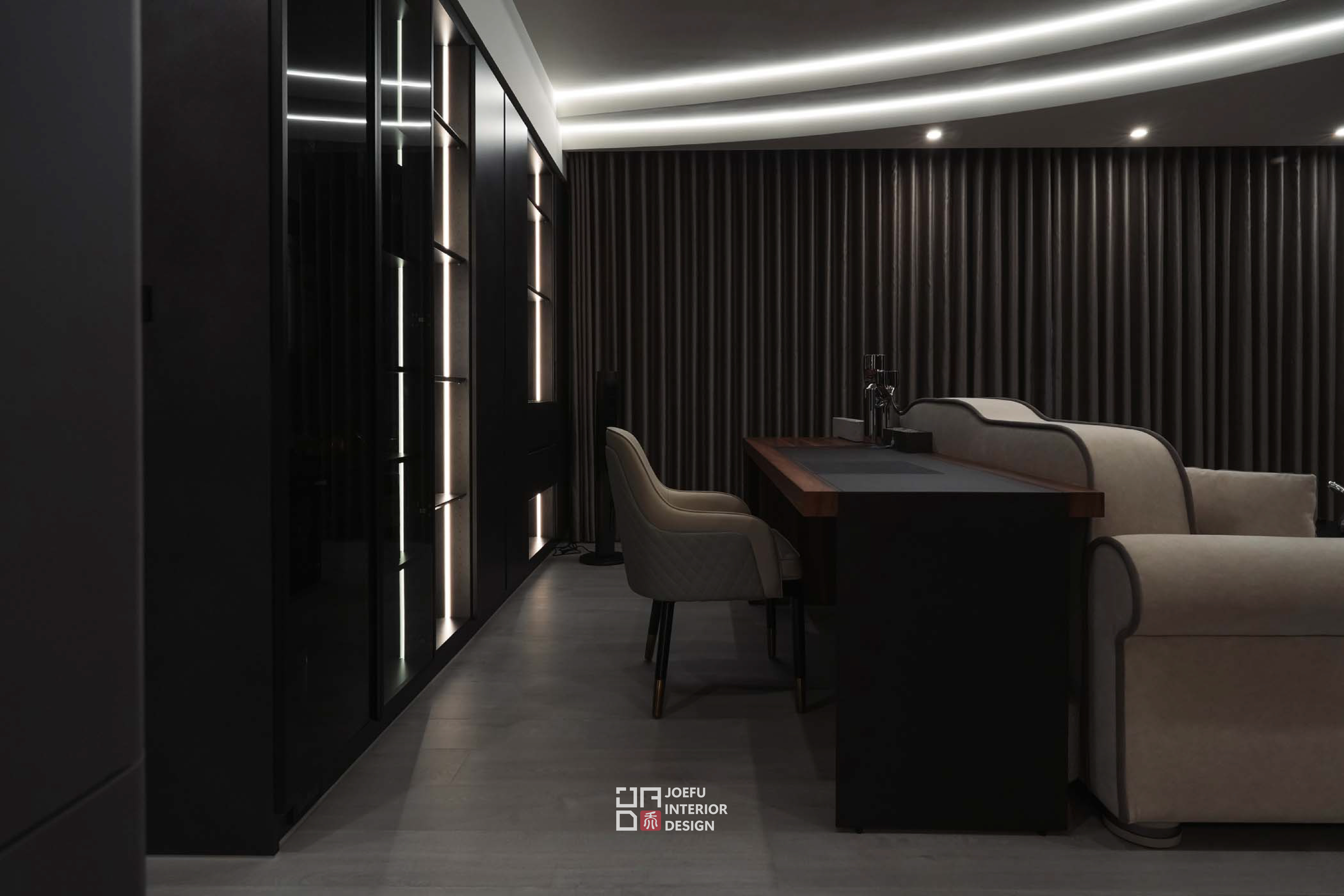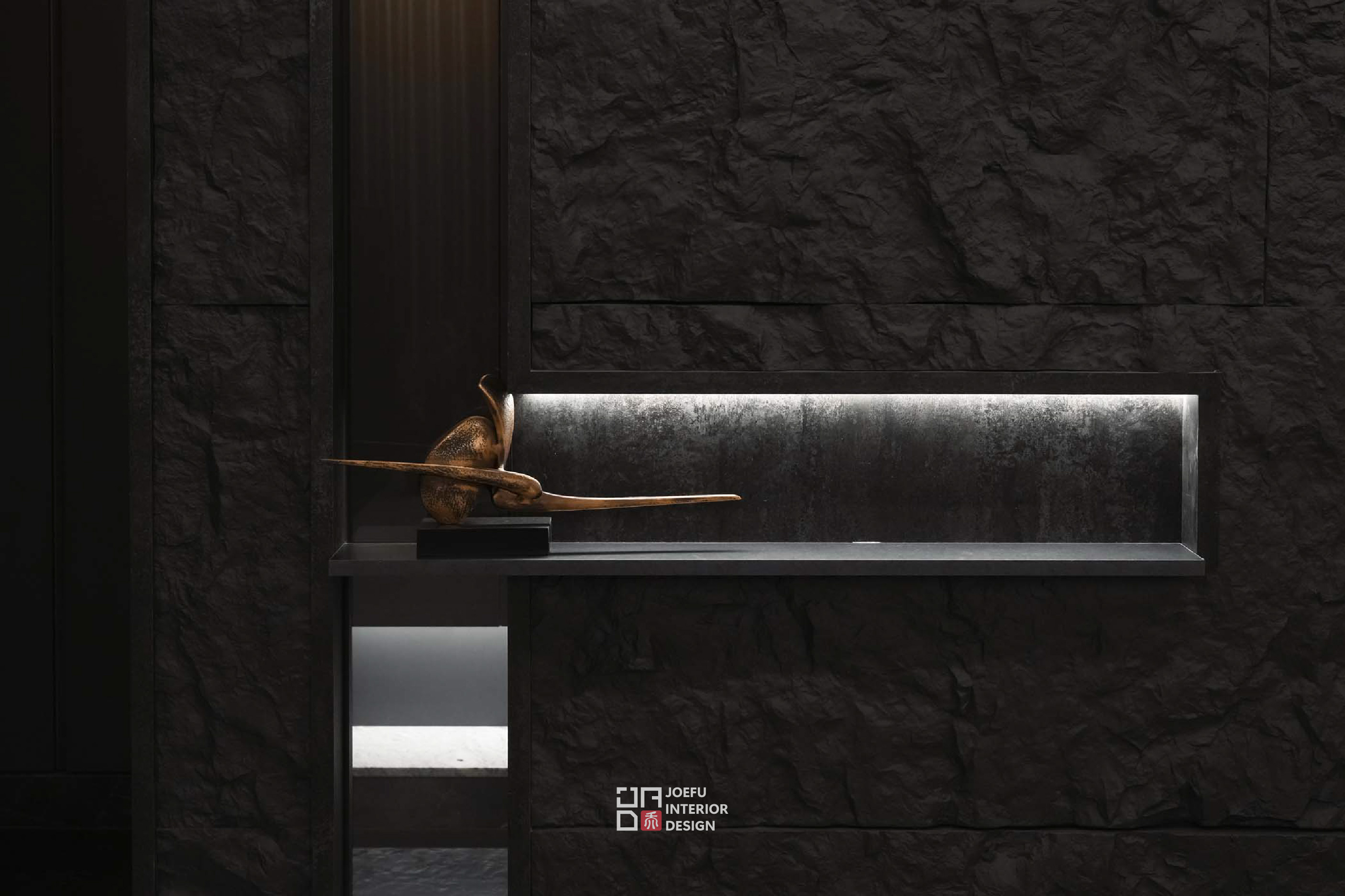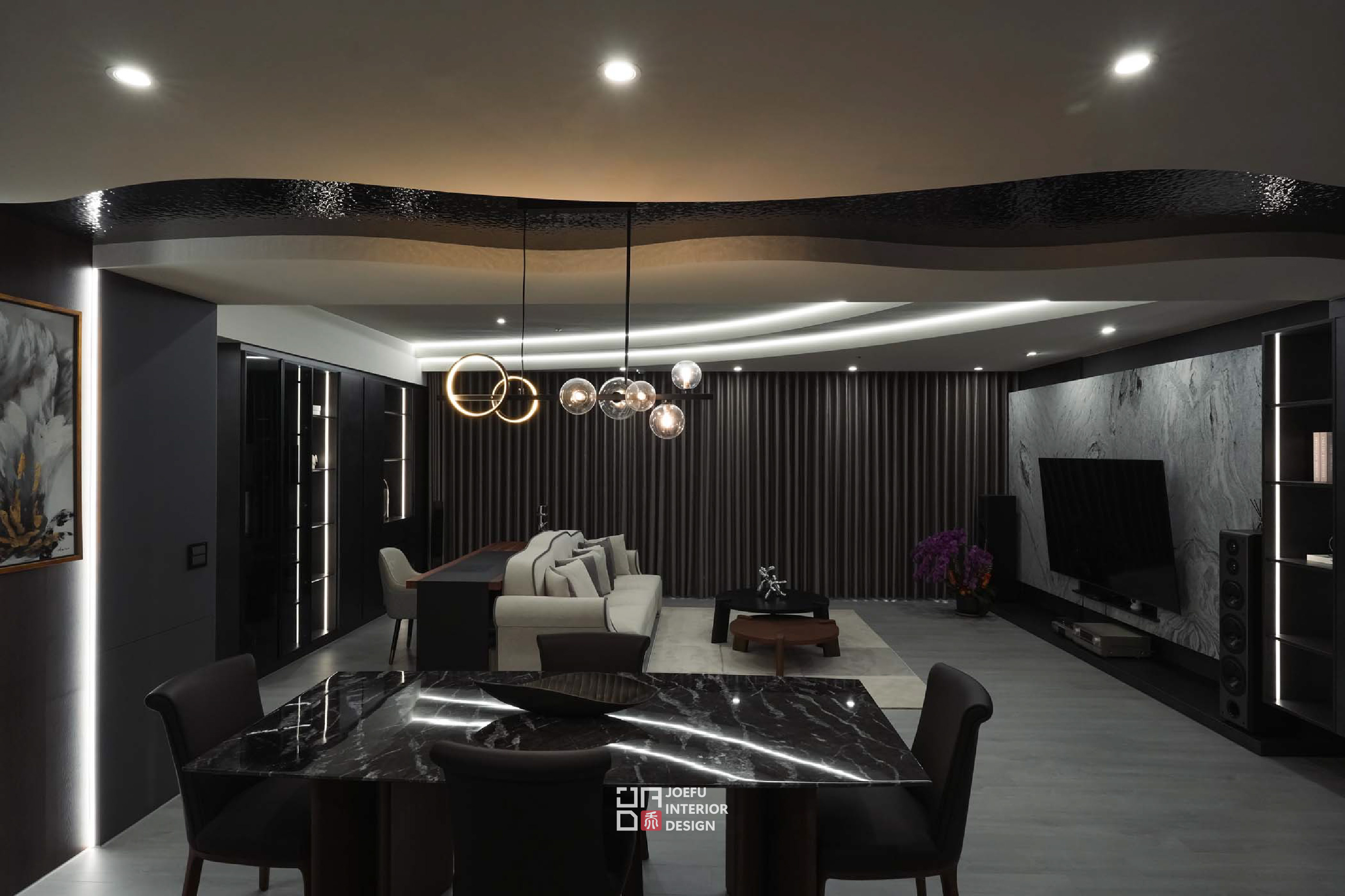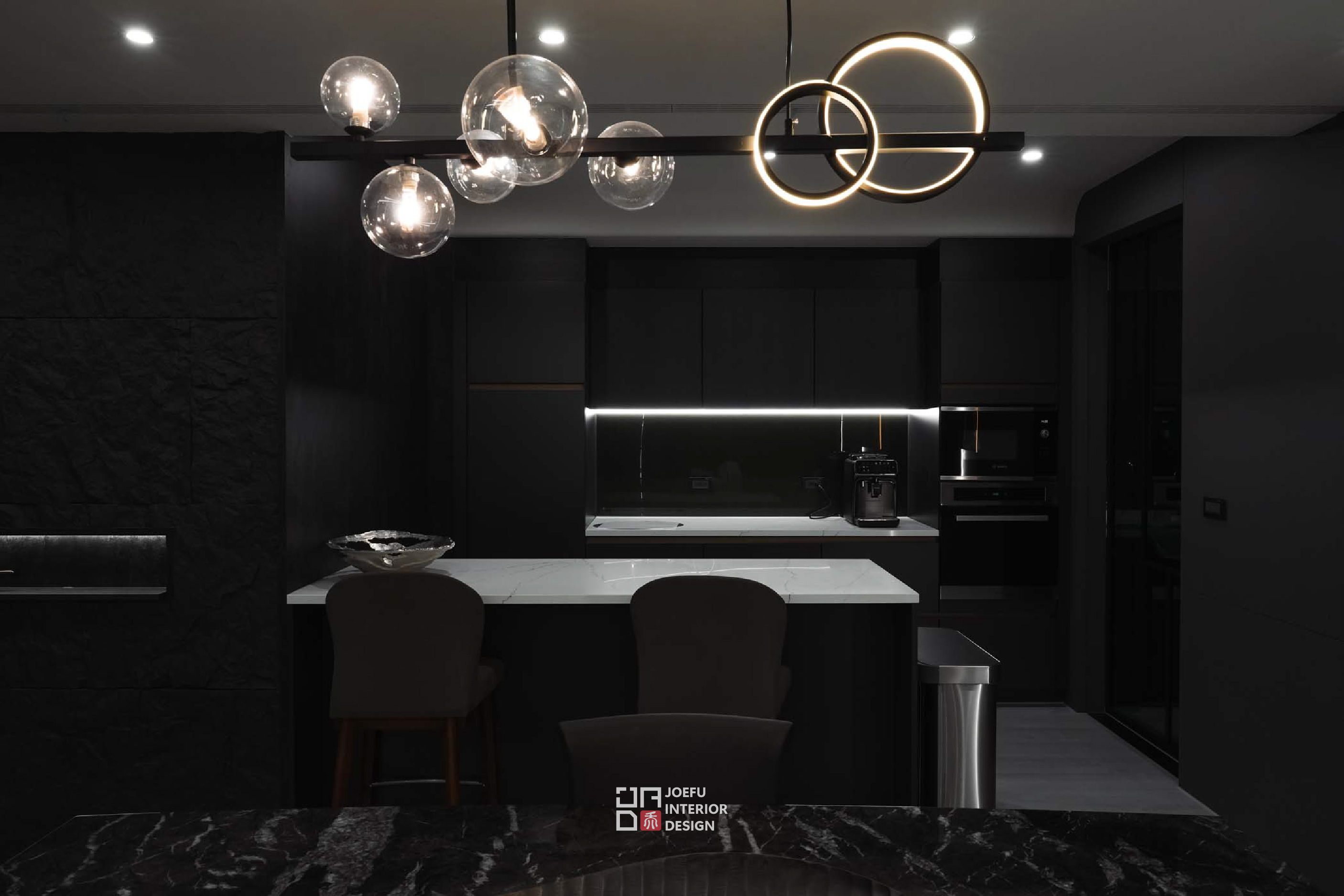 本案為毛胚屋,設計之初即設定以深色調為主軸,業主可接受沉穩色域與高對比材質,希望創造一處兼具男性氣質與精緻生活品味的空間。設計師從黑、灰、金屬的構圖中鋪陳材質層次,選用表面粗獷的石材以及帶有鏽蝕感的金屬作搭配